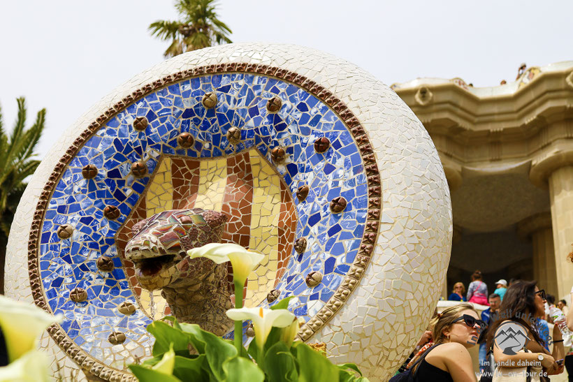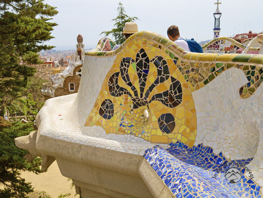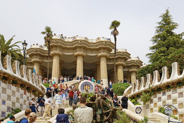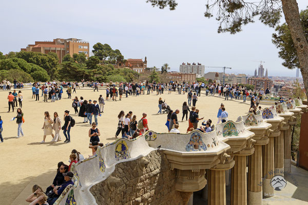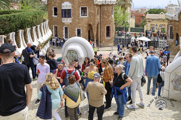 Dann nehmen die Besucherströme zu – wir sind richtig und schnaufen bergauf in den Parc Güell. Fast zwei Stunden bummeln wir durch die aussichtsreiche Grünanlage, steigen hinauf zum höchsten Punkt mit den drei Kreuzen und gehen wieder hinunter zum vollen und fotogenen Eingangsbereich. Entsprechend dicht bevölkert ist er mit Instagram-Girls und asiatischen Reisegruppen, die mit Selfie-Sticks bewaffnet sind.