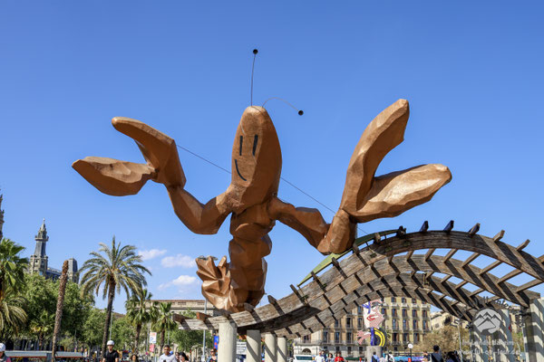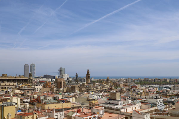 Frisch gestärkt lassen wir uns nun in Richtung Wasser treiben. Die Menschenmassen werden immer dichter und wir wollen heute eine Fahrt mit der Metro vermeiden. Stattdessen suchen wir die Wege, die nicht ganz so bevölkert sind. Dabei kommen wir am Rathaus vorbei, das am Sant Jordí Tag seine Tore geöffnet hat und zur Fahrt hinauf auf die Aussichtsterrasse einlädt. Zwar mit Sicherheits-Check, aber gratis und der Eingang so versteckt, dass wir ohne Warteschlange mit dem Lift hinauffahren können. SUPER!!!