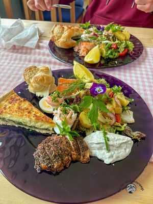 In Vassbacken finden wir ein geöffnetes Restaurant und legen eine spontane Einkehrpause ein. Im Angebot ist eine köstliche Osterplatte mit verschiedenen Spezialitäten, wie Räucherfisch, Quiche, Käsebrioche, Salat, Kartoffeln und Dips. »A bissle was von Ällem«, wie der Schwabe sagt.