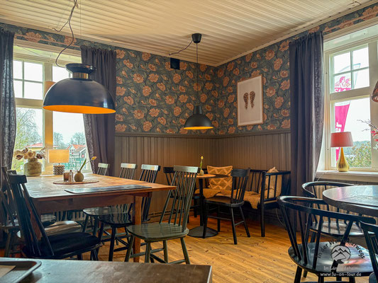 Eine Erkenntnis zu den Restaurants in Schweden, die wir inzwischen gewonnen haben. Die Gaststätten und Cafés funktionieren in einer Art Selbstbedienungsprinzip. Es gibt einen Service- und Kassenbereich, an dem man seine Bestellung aufgibt und gleich (mit Karte) bezahlt. Kalte Gerichte, wie etwa Kuchen oder Sandwiches, werden dort gleich ausgegeben und man nimmt sie auf einem Tablett mit an den Tisch. Warme Gerichte werden entweder serviert oder per Piepser aufgerufen, so dass man sie abholen kann. Kaffee und Tee gibt es an einer extra Theke zur Selbstbedienung und man kann nachschenken, so oft man möchte. Einfaches Leitungswasser steht ebenfalls bereit. Das Prinzip funktioniert, jeder räumt sein Geschirr wieder ab und so werden die auch in Schweden raren Servicekräfte überflüssig. In gehobeneren Etablissements sieht das vielleicht anders auch, aber in den meisten Gaststätten und Cafés ist dies gängige Praxis. Durchaus nachahmenswert, wie wir finden.