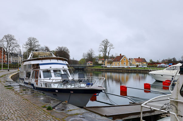 Wir haben uns für zwei Nächte auf einem sehr komfortablen Stellplatz in Borensberg eingeloggt. Er liegt ebenfalls direkt am Götakanal und war über die Ostertage komplett ausgebucht. Für 300 Skr die Nacht genießen wir den Luxus einer Rundum-Versorgung inklusive Waschmaschine und Trockner. Bei unserer Ankunft ist der Platz noch fast voll belegt. Somit erledigen wir zunächst einen Teil unserer Wäsche, machen ein wenig Hausputz und starten in einer Regenpause einen Spaziergang durch Borensberg. Der Ort gefällt uns auf Anhieb besser als Motala, obwohl es auch hier (in der Saison) touristisch zugeht. Nicht so am Ostersonntag, denn obwohl einige Besucher da sind, hat alles noch geschlossen. Auf dem Stellplatz kommen wir noch ins Gespräch mit einer schwedischen Nachbarin, die uns mit Tipps für Stockholm und unsere Weiterfahrt gen Norden versorgt.