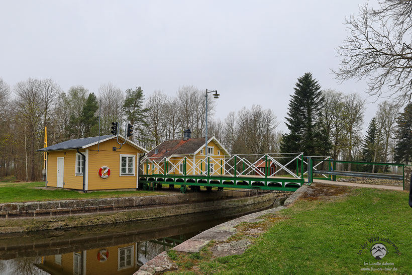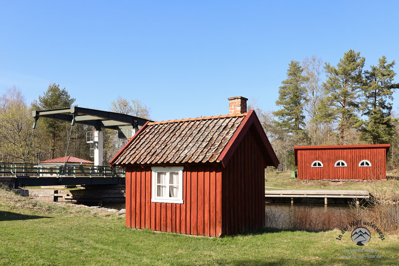 Das Osterwetter wird leider eher schlechter als besser, so dass wir weiterfahren zu unserem zweiten Standort am Götakanal. Zunächst jedoch geht es über stille und einsame Straßen vorbei an hübschen Sommerhäusern, durch Wälder und weite Felder. In Forsvik legen wir einen ersten Stopp bei einem Industriedenkmal ein. Einst war dies ein Komplex aus Schmieden, Mühlen und Wasserkraftwerken. Der Götakanal brachte Aufschwung und einst war Forsvik ein bedeutender Industriestandort. Heute sind davon noch eine Art Freilichtmuseum, die höchste Schleuse des Kanales sowie die älteste Eisenbrücke Schwedens erhalten.